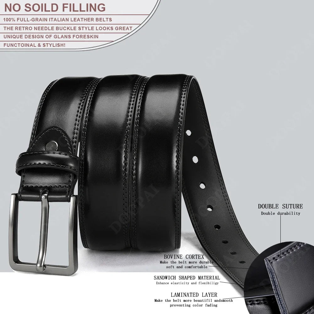 Men’s business belt made from premium double-layer cowhide with a durable metal needle buckle. Features adjustable sizing and a sleek design suitable for office, formal, or everyday wear. Available in multiple colors.