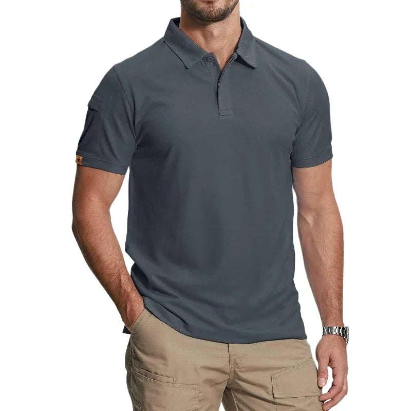 Men’s short sleeve polo shirt made from breathable, lightweight polyester. Features a solid design with button closure and pockets. Moisture-wicking and anti-pilling properties make it ideal for daily wear, sports, golf, tennis, or casual streetwear.