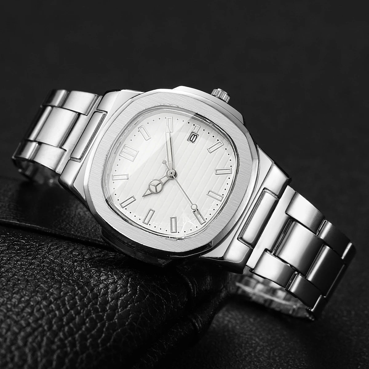 Men’s wristwatch featuring a square alloy case and stainless steel strap with folding clasp. Numberless needle display with built-in calendar function. Sleek and versatile design suitable for business, casual, and everyday wear.
